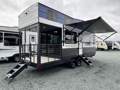 Any amount of time in this travel trailer will be time well spent! The rear entry door leads to the covered porch with a loft area above and a queen-size bed. The patio door leads into the main living area where you can enjoy the sofa or dual lounge chairs with a pull-out table. Once you head to the front of this unit, you'll find the full kitchen with three burner gas cooktop to cook meals on each day. There is also a pantry and 10 cu. ft. refrigerator for food storage. The front full bath includes a shower with a seat, a toilet, sink, and a linen closet to keep clean towels close by. There is even a second loft above the kitchen and bath where you'll find a second queen-size bed and storage space for your things; how convenient!